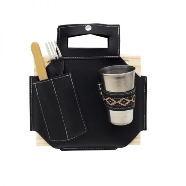 Set de asado cuadrado con cubiertos estuche y vaso de aluminio